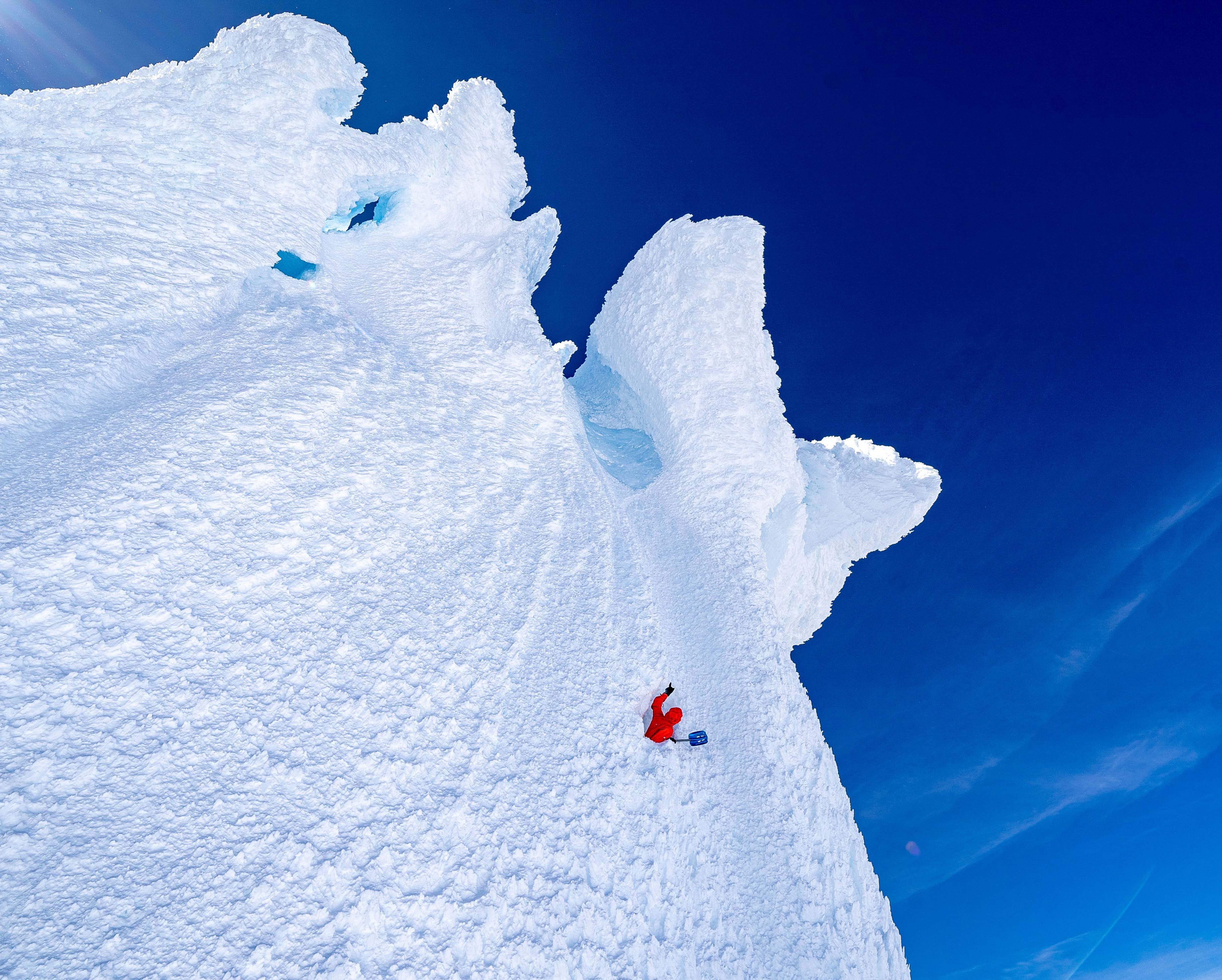 Kurz bevor ich loslege, bekomme ich von einem hechelnden Amerikaner eine Lawinenschaufel und ein „Good Luck“ zugesteckt. Er hats geschafft die komplette Strecke bis ins Biwak mit Fixseilen zu versehen und mit Schaufel und einer Steigklemme zu uns zu kommen. In unter einer Stunde. Das bringt auch den Vorteil mit sich, schnell wieder nach unten zu kommen, für den Fall dass das Schlechtwetter hereinzieht. Bestens ausgerüstet mache ich mich an die Arbeit und komme so um einiges schneller voran als meine Vorgänger. Komplett durchnässt und durchgefroren steche ich Block für Block aus dem Berg und lasse sie voller Spaß in die Tiefe rauschen. Ein abgefahrenes Szenario. Nach einiger Zeit verhärtet sich der Schnee und ein natürlicher Eisüberhang drängt meine Tunnelpläne etwas ab. Bald schon sehe ich das Sonnenlicht blau durch den sonst bereits dunklen Tunnel schimmern, und mit letzter Kraft grabe ich mich an die Oberfläche. Ähnlich eines Maulwurfs. Bloß in der Vertikalen, und komplett durchnässt. Großes Jubeln. Aber über mir sind‘s immer noch 10m verfestigter Schnee, ehe das Eis durchschimmert. Zu meinem großen Glück sehe ich, wie sich Claudio schon hochmotiviert mit Eisgeräten ausrüstet und mich ablöst. Selten habe ich’s erlebt, dass so viele unterschiedliche Seilschaften so reibungslos zusammenarbeiten, um ihr gemeinsames Ziel zu erreichen. Keiner muss der Erste sein, alle schauen aufeinander und die Stimmung ähnelt eher einem Sportklettergarten, wo man sich gegenseitig anfeuert. Bloß mit 1000m Luft unterm Arsch. Und bei -10°C. Claudio macht seinen Job hervorragend und hat die Schwierigkeiten schon bald hinter sich. Leo und ich fixieren von ihm gesichert die Seile, damit der Rest der Truppe aufsteigen kann. Gipfel gegen 14Uhr. Eigentlich wollte wir spätestens um 12 Uhr umkehren. Schön langsam wird’s aber höchste Zeit. Trotzdem genießt jeder den Moment, schaut in die Ferne des Inlandeises und bewundert die gegenüberliegenden Felstürme. Absolute Freude durchdringt mich, schon lange nicht mehr wurde mein Körper so stark mit Endorphinen durchspült.