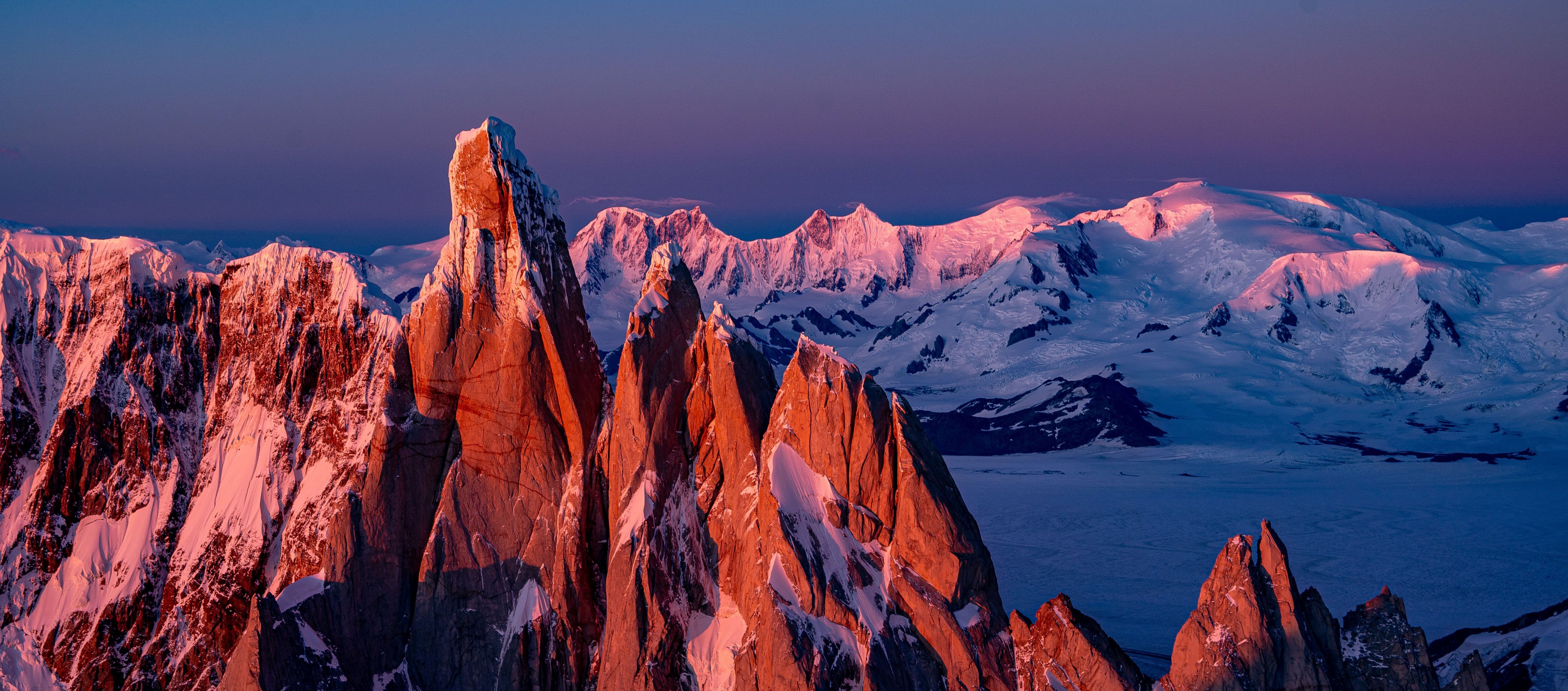 Gedauert hat das Schauspiel wohl etwas mehr als 2 Stunden, zumindest ist es schon spät Abends, als wir glücklich aber todmüde einen geeigneten Biwakplatz finden. Und was für einen. Auf der einen Seite die ewige Weite des Inlandeises, auf der anderen Seite bauen sich die 3 Gipfeleispilze des Cerro Torre vor uns auf. Das letzte Abendlicht projiziert surreale Farben in den Himmel und lässt den Fitz Roy und die Poincenot in schon fast kitschigen Orange- und Rottönen erstrahlen. Diese beiden Felsgipfel sind neben dem Cerro Torre die höchsten in dem ganzen Gebiet.