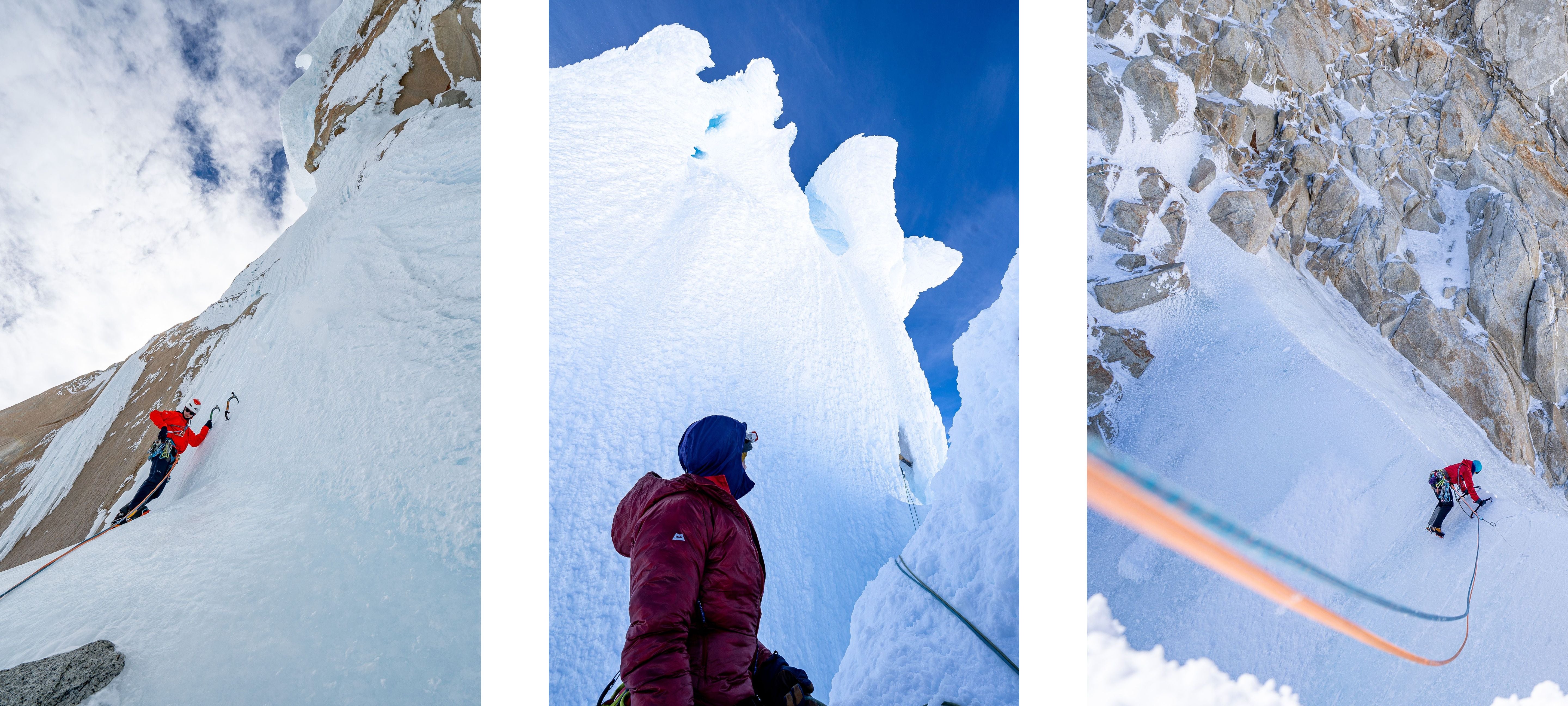 Für mich ist das aber noch zu weit unten, zumal am nachfolgenden Tag ja schon wieder eine Wetterverschlechterung angesagt ist. Die daraus resultierende Nervosität treibt mich an, so lösen wir die Italiener ab und steigen weiter. Einfache Seillängen führen uns zum Mixedgelände, darüber erwartet uns mit der Headwall das steilste Stück des Berges. Jetzt übernimmt Susi die Führung. Biwakplätze sind hier Mangelware, zudem will man sich unter den gewaltigen Eispilzen des Gipfels nicht wirklich lange aufhalten. Die tiefen Temperaturen sorgen jedoch für ein gutes Gefühl in der Magengrube und die Motivation, in einer solchen Landschaft unterwegs zu sein, erledigt den Rest.