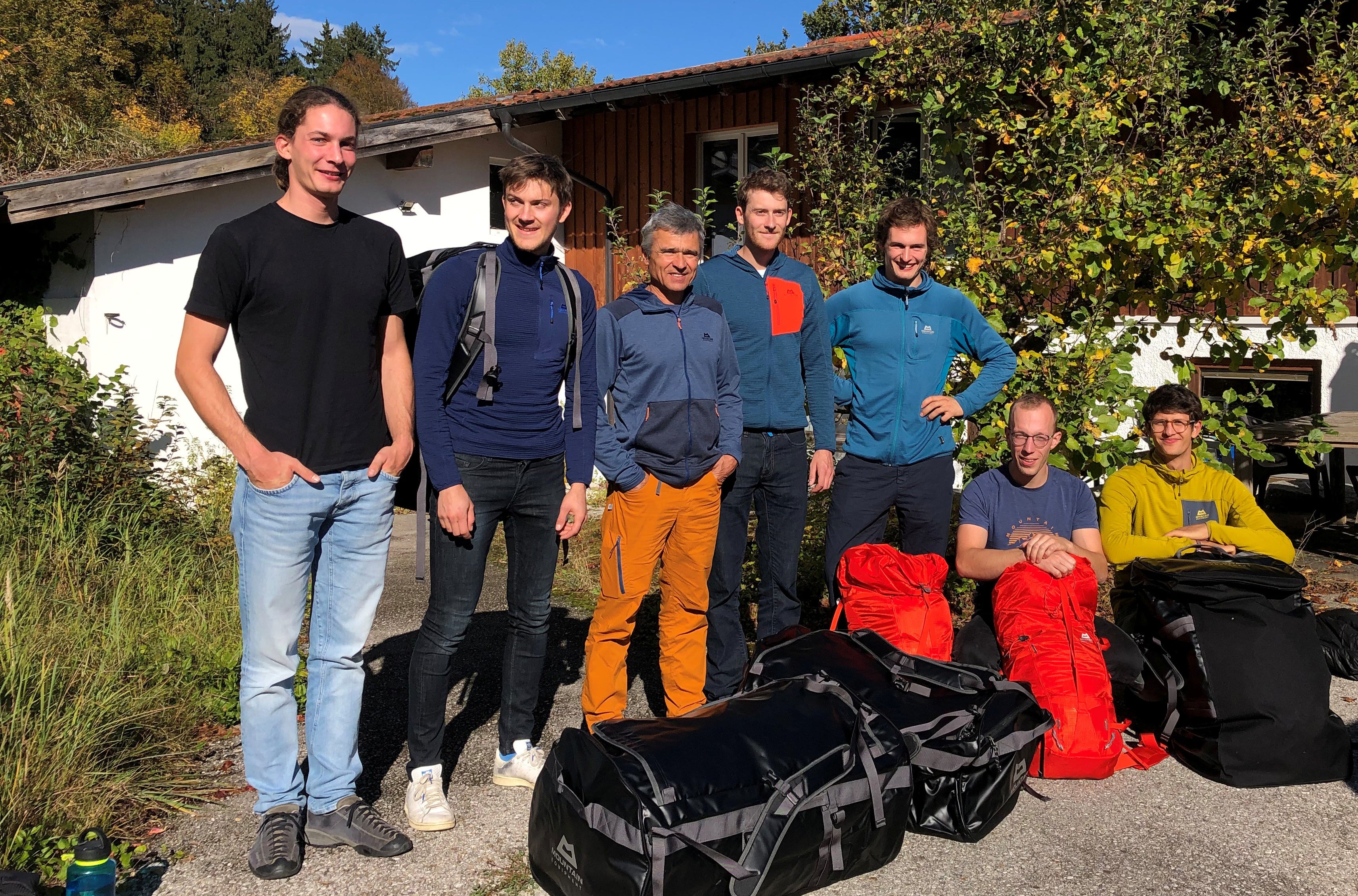 Die Mitglieder des aktuellen 2023-2025 DAV Herren Expeditionskaders bei ihrem Besuch bei Mountain Equipment in Eurasburg (von links nach rechts): Leon Schaake, Florian Frank, Thomas Strobl (Geschäftsführer ME), Josef Vögele, Jonas Fertig, Hannes Tegethoff und Luis Funk Foto Mountain Equipment