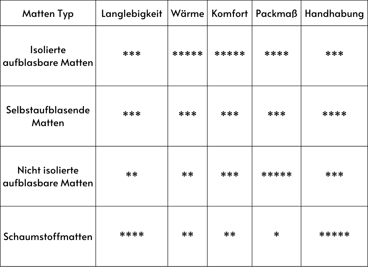 Egal wo deine Priorität liegt, sei es Gewicht, Packmaß oder bestmögliche Isolation, hier findest du alle Infos, um die für dich richtige Matte auszuwählen.