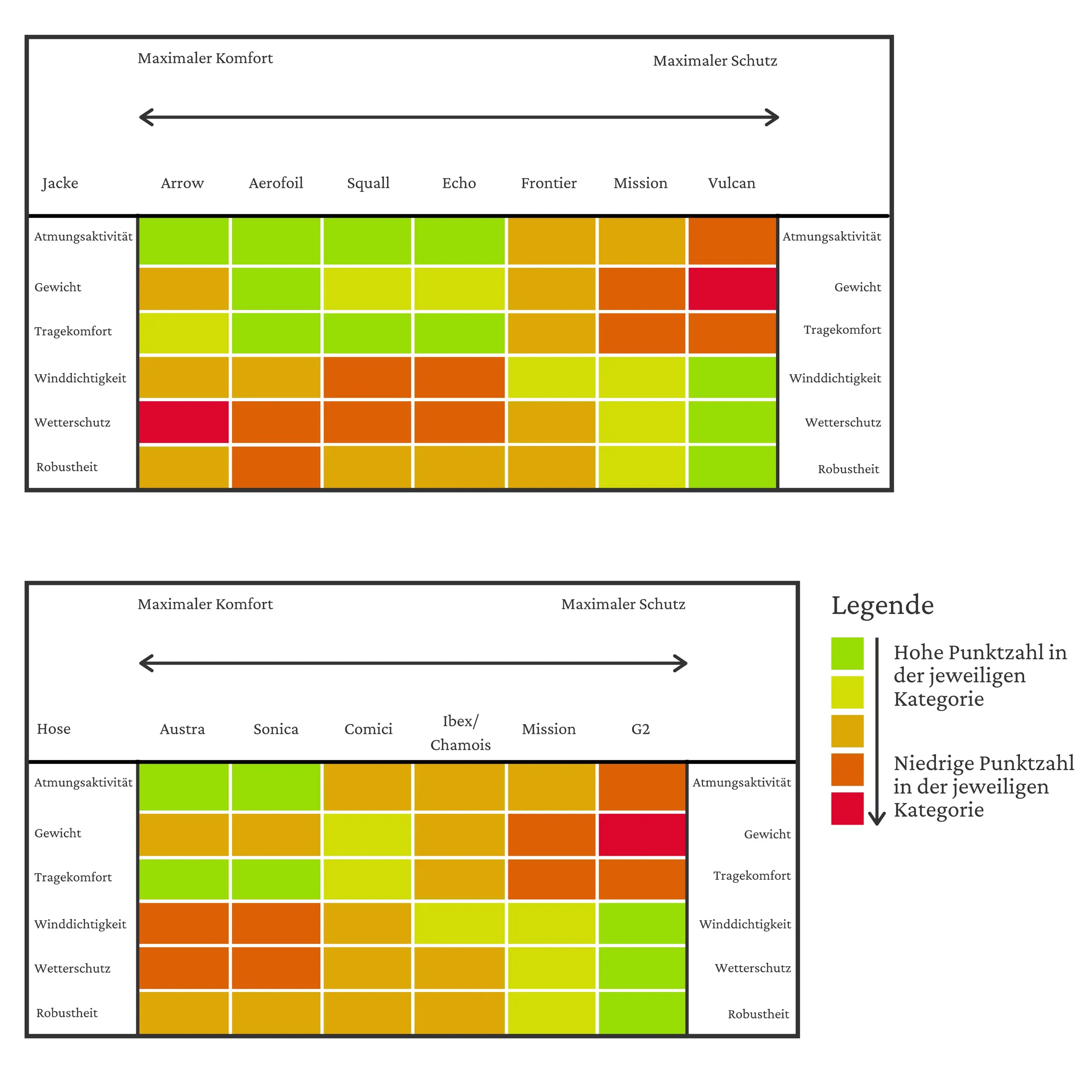 Generell gilt: je höher der Wetterschutz, desto geringer die Atmungsaktivität und damit der Komfort. Das haben wir unserem Blogbeitrag „Winddichtigkeit vs. Atmungsaktivität“ etwas genauer erklärt. Unsere verschiedenen Softshell-Produkte lassen sich in Bezug auf Schutz und Komfort in etwa so einordnen: