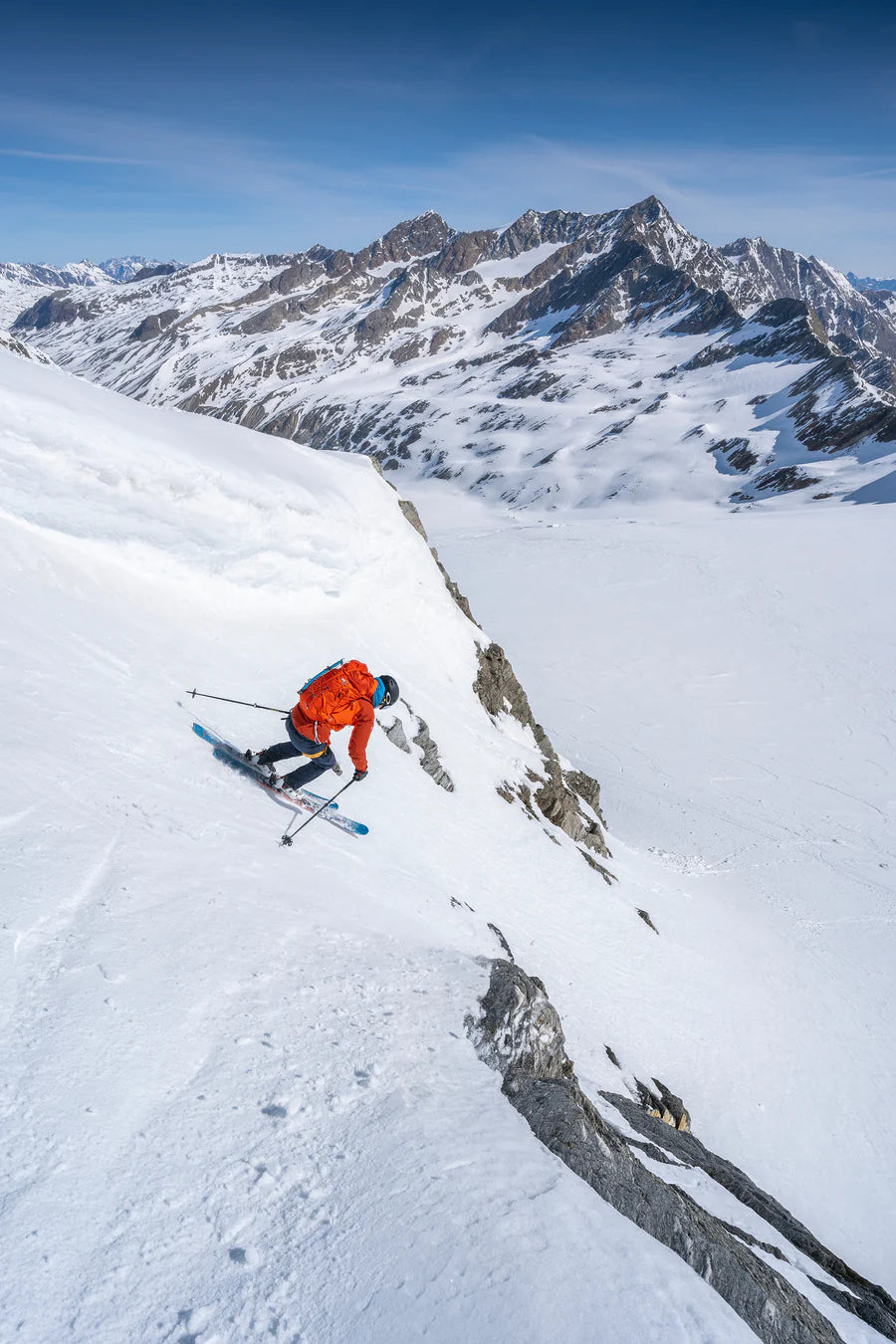 Eine warme Jacke mit Daune oder Kunstfaser ist dein Joker im Rucksack, wenn es kälter ist als erwartet, du eine lange Abfahrt vor dir hast oder die Gipfelpause ohne Frieren genießen willst. Bei nasskaltem Wetter ist Kunstfaser besser als Daune, da sie auch in feuchtem Zustand wärmt. Meistens greifen wir aber zur Daunenjacke, da Daune (bei gleicher Wärmeleistung) weniger Gewicht und Packvolumen hat.