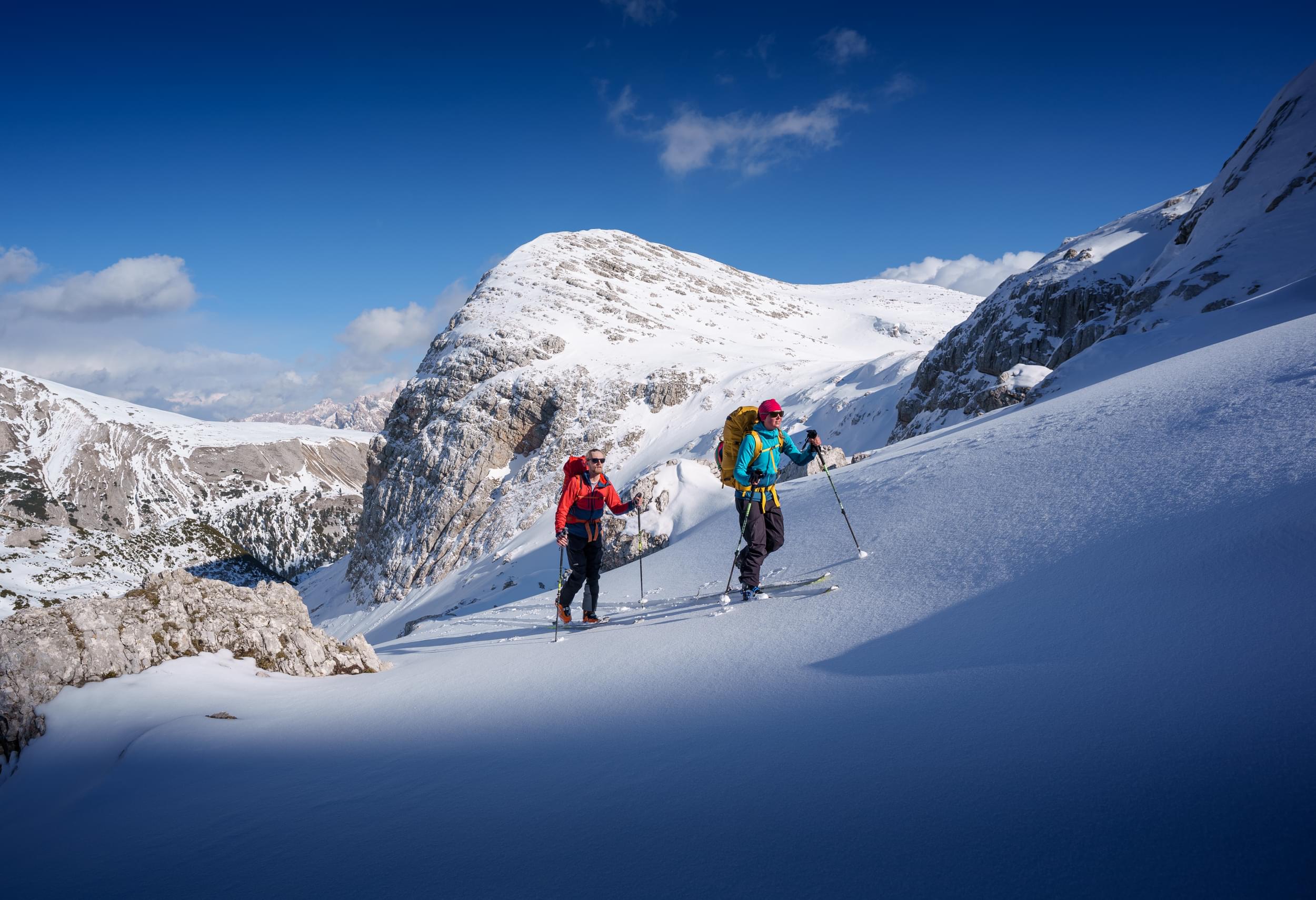 Bekleidung für Skitouren orientiert sich mehr am Bergsteigen als am Skifahren: Pistenskifahrer tragen zwar schön warme und wasserdichte Jacken und Hosen, die dafür aber schwer und sperrig sind. Bergsteiger und Tourengeher benötigen hingegen leichte, bequeme und anpassungsfähige Bekleidung. Auch wenn es bei Skitouren sehr kalt sein kann, kommt man im Aufstieg oft ganz schön ins Schwitzen – nur, um dann bei der nächsten Pause schnell zu frösteln. Dafür brauchst du also ein Bekleidungssystem, dass du flexibel an verschiedene Situationen anpassen kannst.